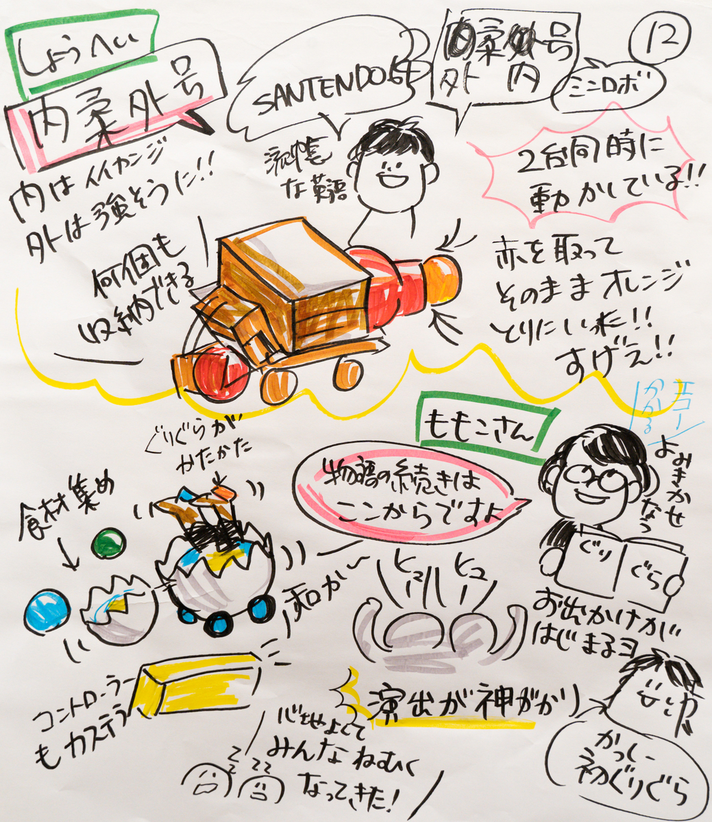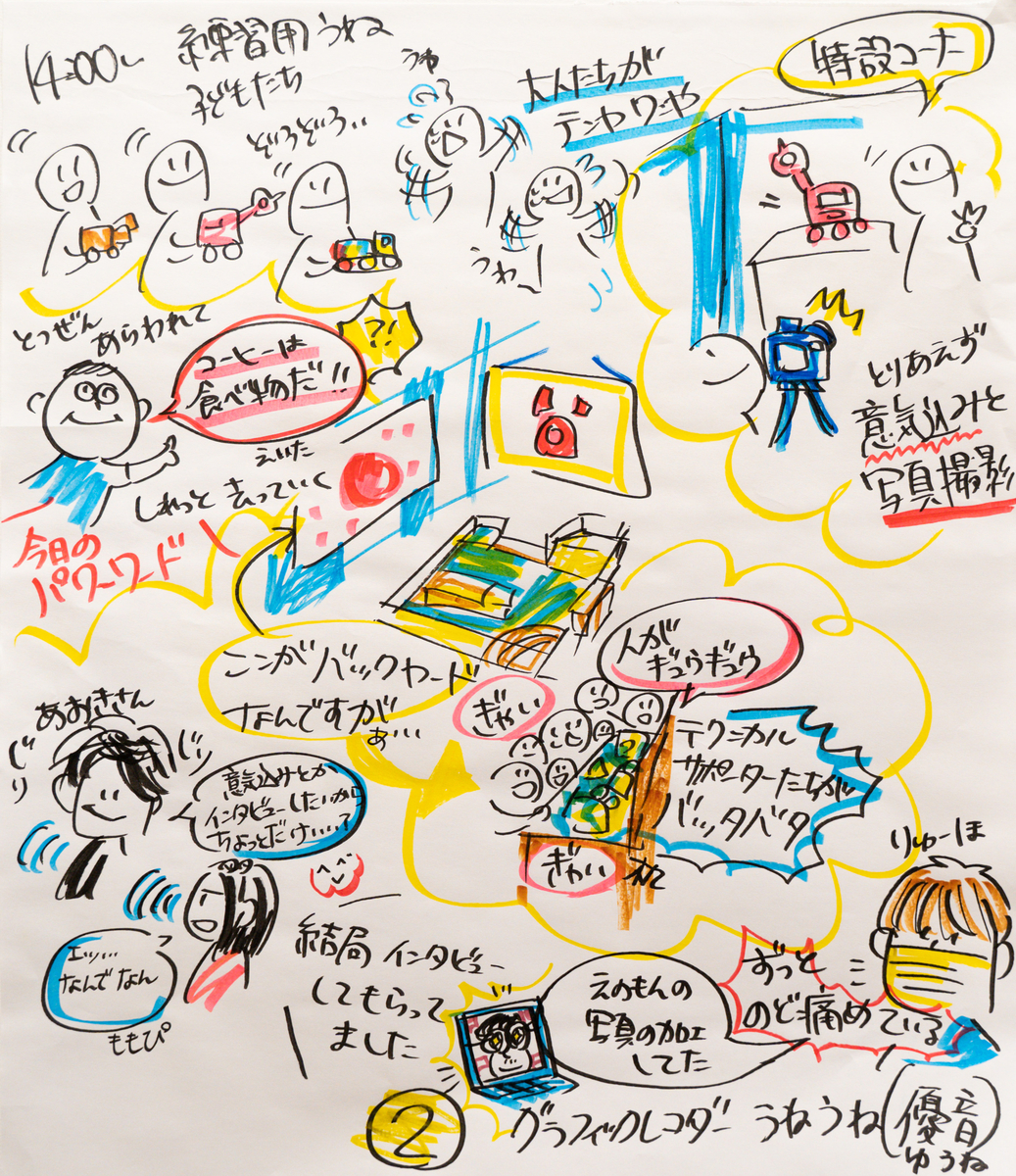 一人で描いているとそういった気づきは生まれにくいものなので、複数で役割分担をしながら記録をするのも新鮮で楽しいと感じました。ところどころに、色んな人の編集されていない痕跡が残っているのもリアルタイムならではの良さですね。子どもの視点から見たグラレコは素直であたたかいなぁと思いました。