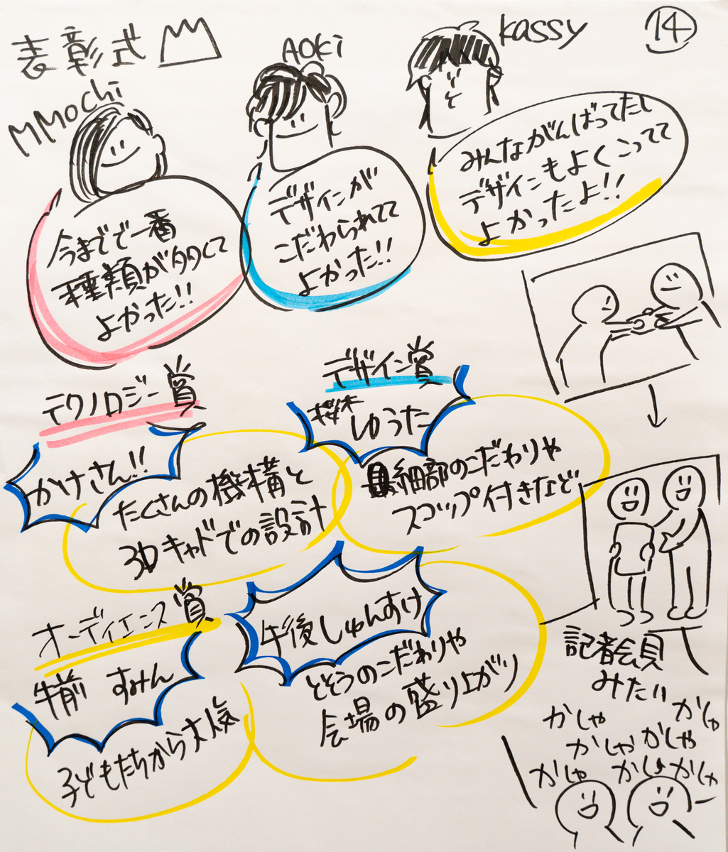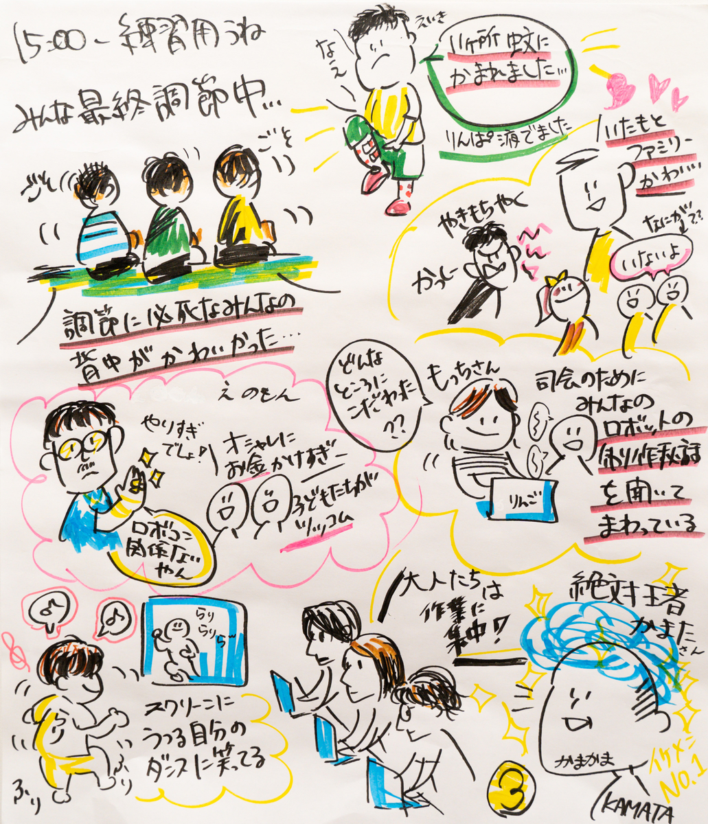 終始みんながバタバタしている印象でした。常に誰かを探していたり、大きな声でアナウンスし続けていたり、テクニカルサポーターの方々がバックヤードでぎゅうぎゅう詰めで作業していたり、時には子どもにちょっかいをかけられて大混乱になっている場面もありました。レコーダーとして側から見ている分には、様々な動きがあって面白い事ばかり起きていましたが、当の本人たちは本当に必死でした。