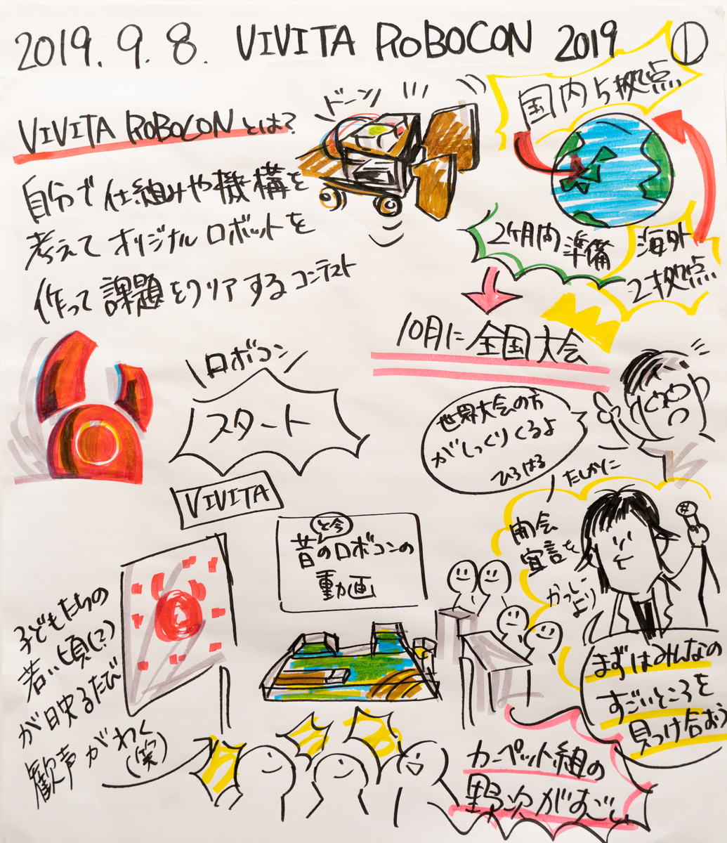 今回は、RTDの中の一つであるグラフィックレコーディングという手法で描いた「VIVITA ROBOCON 2019」 VIVISTOP柏の葉予選をご紹介したいと思います。