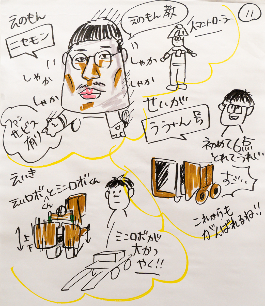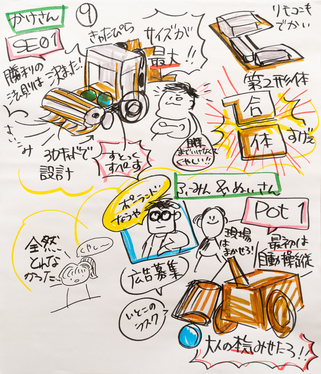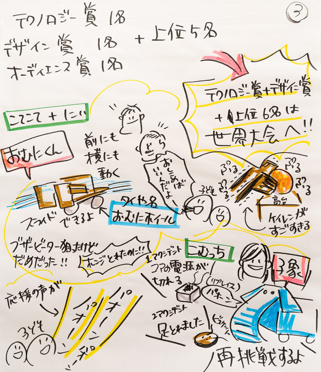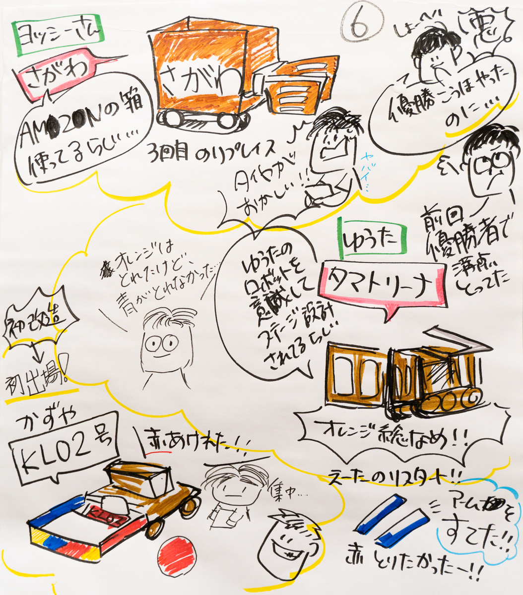 まずは前半戦をご紹介します。練習では起きなかったようなことが次々と起こる魔のステージに子どもも大人も翻弄されていました。 それぞれが5分間という限られた時間の中で集中して競技に挑んでいるため、自分や周りがどんな様子だったかを認知できていません。なので、できるだけ周囲の環境やリアルタイムの声を入れ込めるように描きました。
