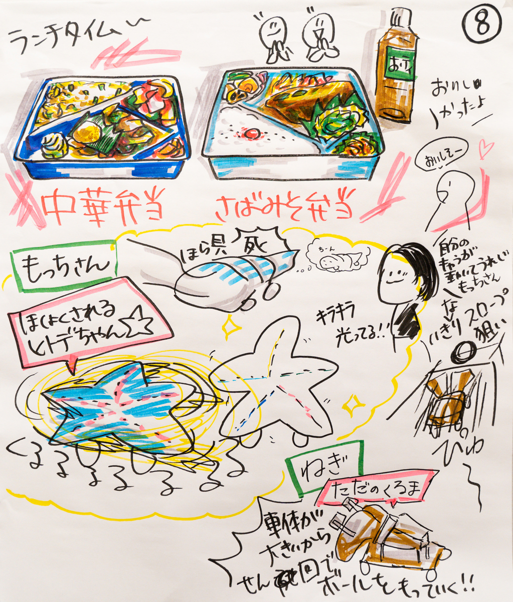 余談ですが、グラレコをしている時に出たご飯は必ず描くというマイルールがあるので、ご飯の描き込みだけ気合の入り方が違います(はたして良いのか悪いのか…)。ご飯が共通のものであれば尚更みんなの記憶にも残りやすいので、しっかり描くようにしています。私はサバ味噌弁当でした。美味しかったです。