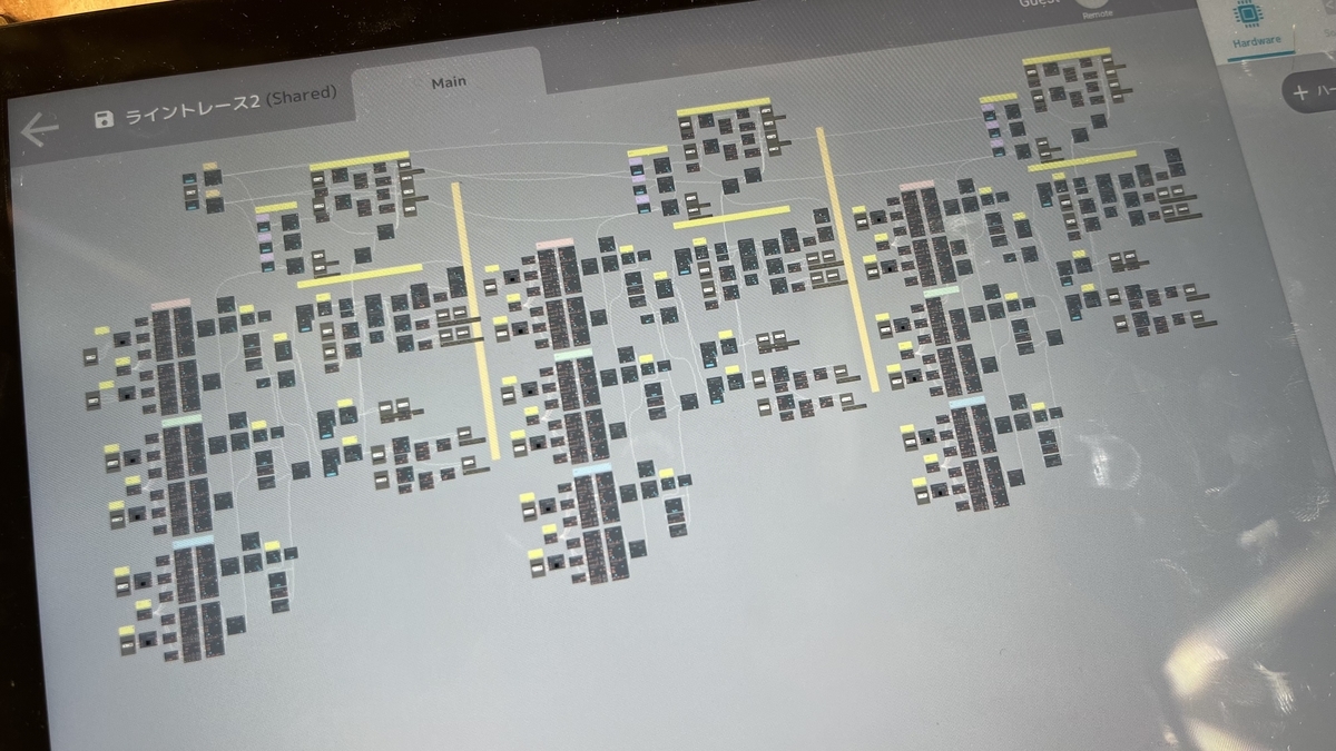 1つのダブレットで3台のロボを操作し、ライン上を走行できるようプログラムをまとめています。シンプルなことを繰り返しているだけなのですが、一見すんごいプログラムに!! ロボットの先端には2台のColor Picker Cellが搭載されており、黒い線を感知する(=ロボが斜めに進んでしまう)と軌道を修正し、まっすぐ進むよう設計されているのです!