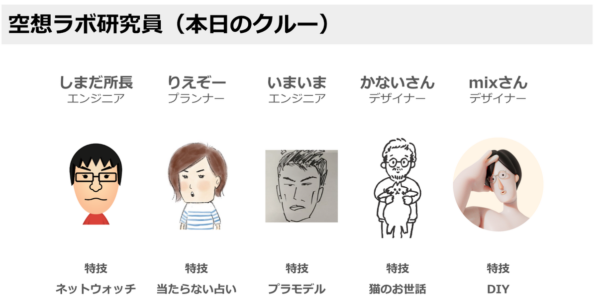 初回ということで、VIVIWARE 空想ラボのしまだ所長(仮)、助手のりえぞー、エンジニアのいまいま、デザイナーのかないさん、撮影のmixさん、合計5人でDMM.make AKIBAに乗り込みました。気合い充分です。