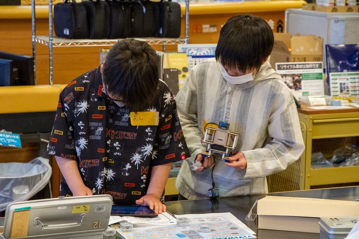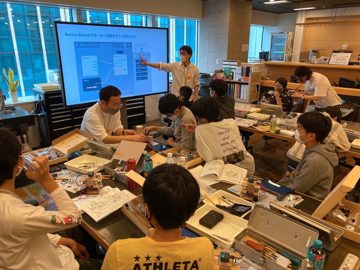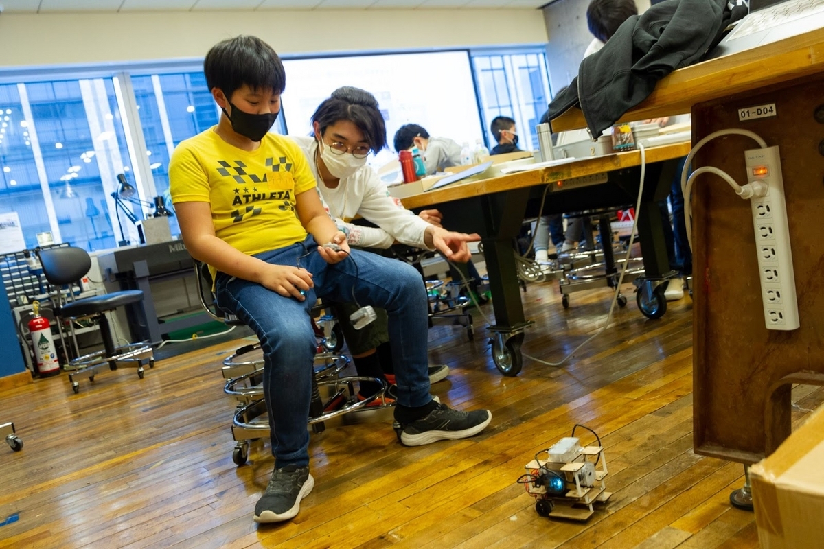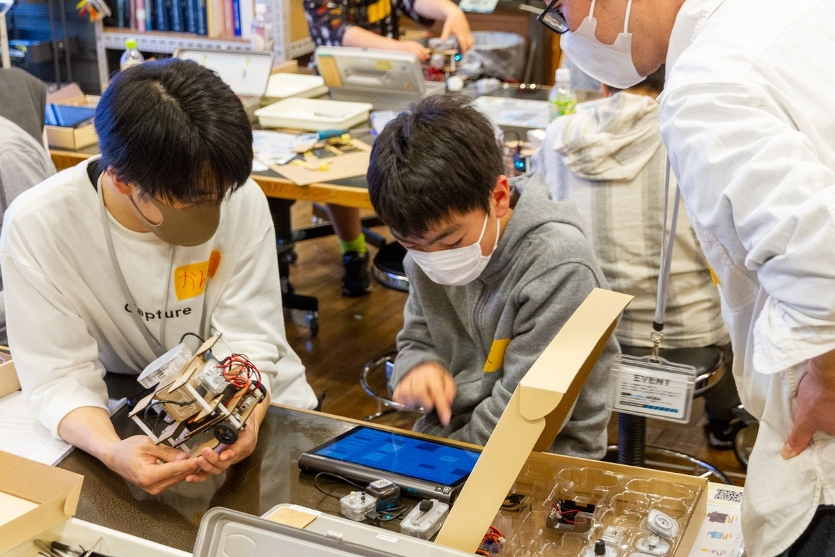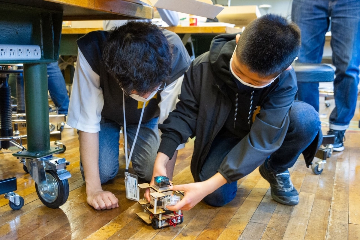 ロボットが組み上がり走らせることができたら、しまだ所長からのミッションにチャレンジ。バックさせたり、スピードを調整したり、音を鳴らしたりするにはどうしたらいいだろう?みんなで頭を悩ませました。