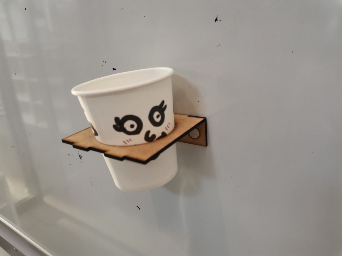 最後は、紙コップホルダー。とてもシンプルなんですがとても便利な一品です。紙コップは曲面かつ絞りが入った形をしているので、このホルダー無しで、ホワイトボードにまっすぐ固定するのは意外と難しいです。もし、これを後からひもで釣り上げようとした場合は、ホワイトボードに直接固定もできないのでこのホルダーはより重要です。