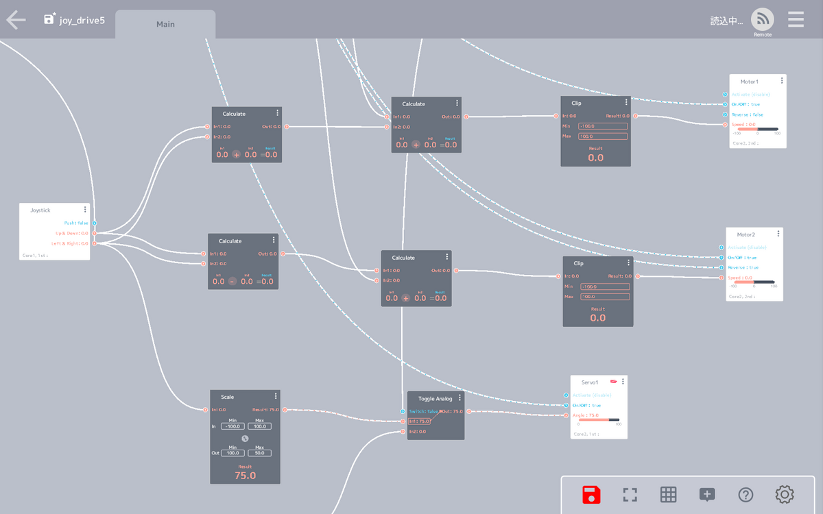 ジョイスティックの上下値と左右値の入力を計算して、ロボットは上:前進、下:後退、右:右回転、左:左回転をします。このとき、左右方向の値に連動して大きな眼が左右に動く仕組みを加えました。曲がる方向に目を向けることでロボットに意志があるように見せるのです。