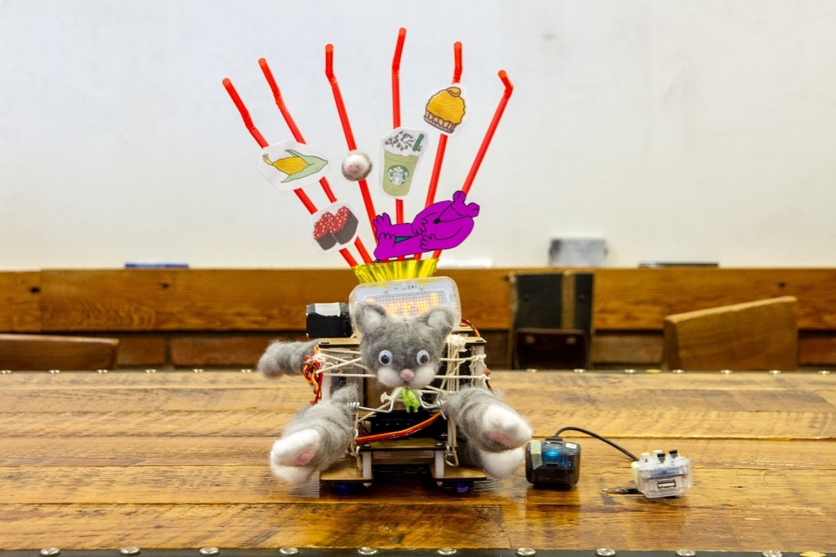 土下座のモーションは、サーボモーターの先端に針金とモールを曲げて作った「クランク機構」をつけることで、猫の頭を下げる時に両腕が上がるようにしました。これによって全身全霊の土下座を実現しています。