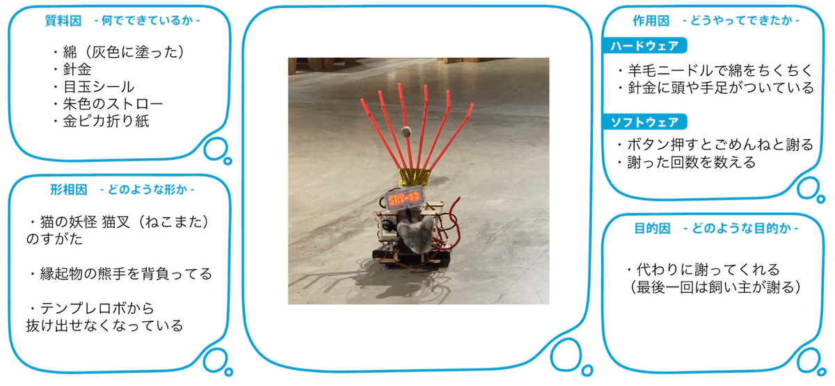 そして私はと言えば、金井師範代の「猫叉ロボ」の筐体(?)づくりを受け持ち、ダイソーで買ったフェルティングニードルと手芸綿をひたすらチクチクしてました。フェルティング自体が全く初めて&何の見本もなく適当に作った割に我ながら器用です。