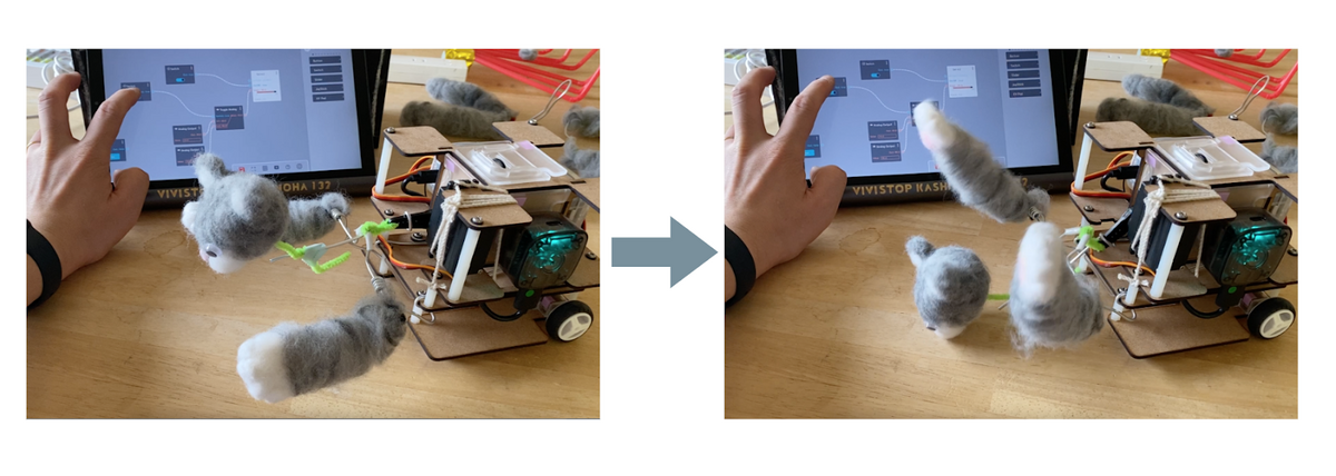 しかしながら、Motion CellやMeasure Cellを使っていざコントローラを作ってみると、操作する本人にはヘンテコ感が感じられるものの見ている側にはそれが伝わらなさそうだったので方向転換をして今回の形に落ち着きました。今回の恐縮ロボに当初想定してたコントローラを組み合わせればもっとヘンテコなロボが完成するかもしれません。