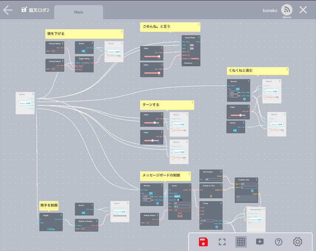 操作は「Buttonセル」のX/Y/A/Bの四つのボタンだけで全ての操作が成り立つように工夫しています。マスターである僕は片手でポチポチとボタン操作をしながら、横でしおらしく立っているだけで良いのです。