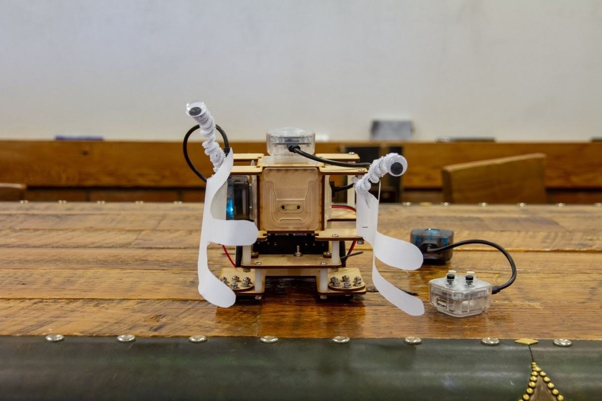 操作する側の前に出そうとする意思に反して後退させるのが基本の動きで、それをきっかけにロボットが自分の動きにびっくりして最終的にはパニックになり制御不能になるのをイメージして制作しました。