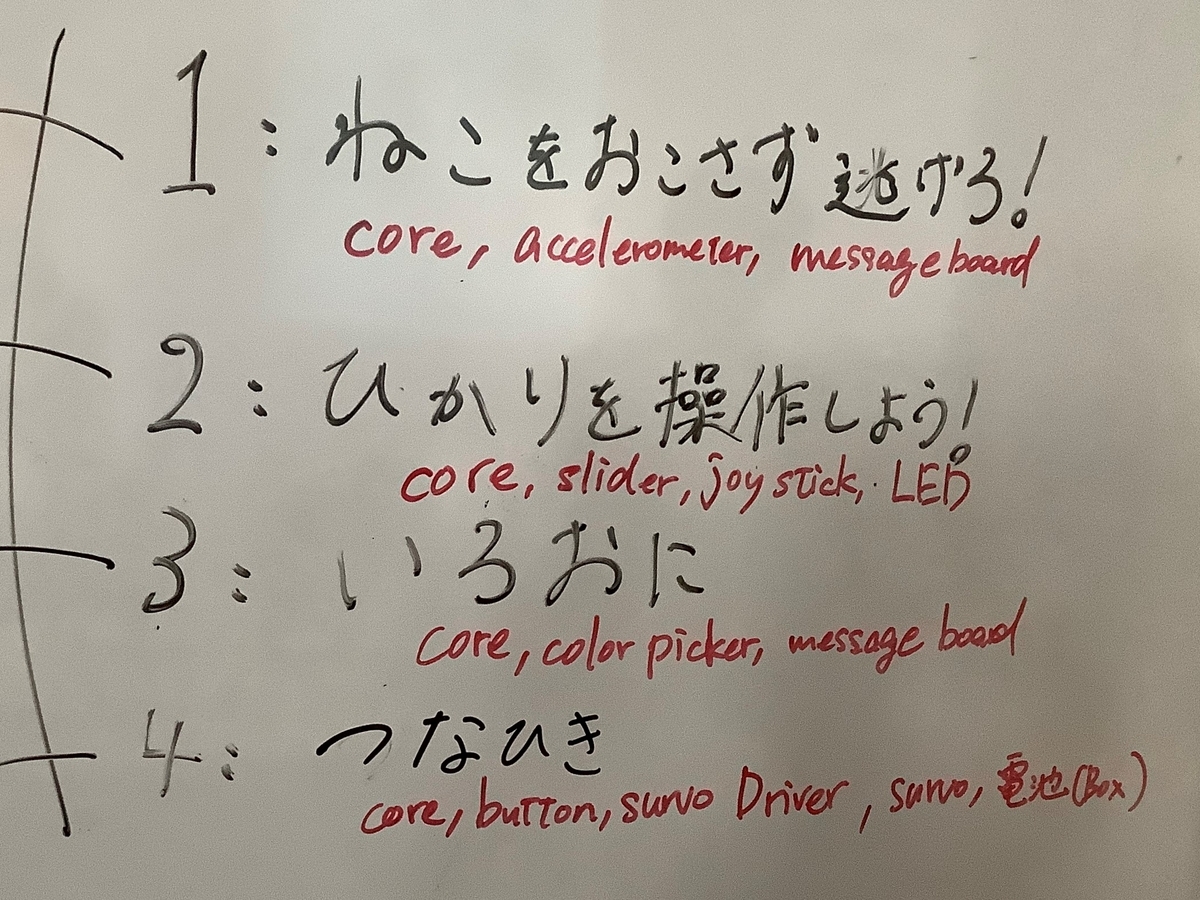 プログラミングの修得を目的とするようなものではありませんし、あらかじめ用意されたキットを組み上げていくようなものでもありません。自分たちでゼロから考え、作り上げていきます。 この企画は、全6回(1回あたり休憩も含めて110分)となっており以下のスケジュールでおこなわれました。
