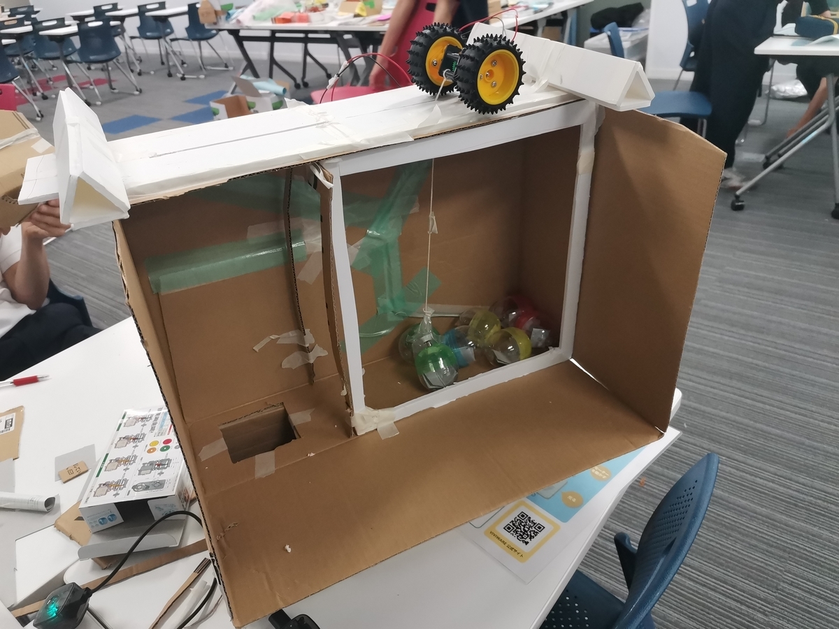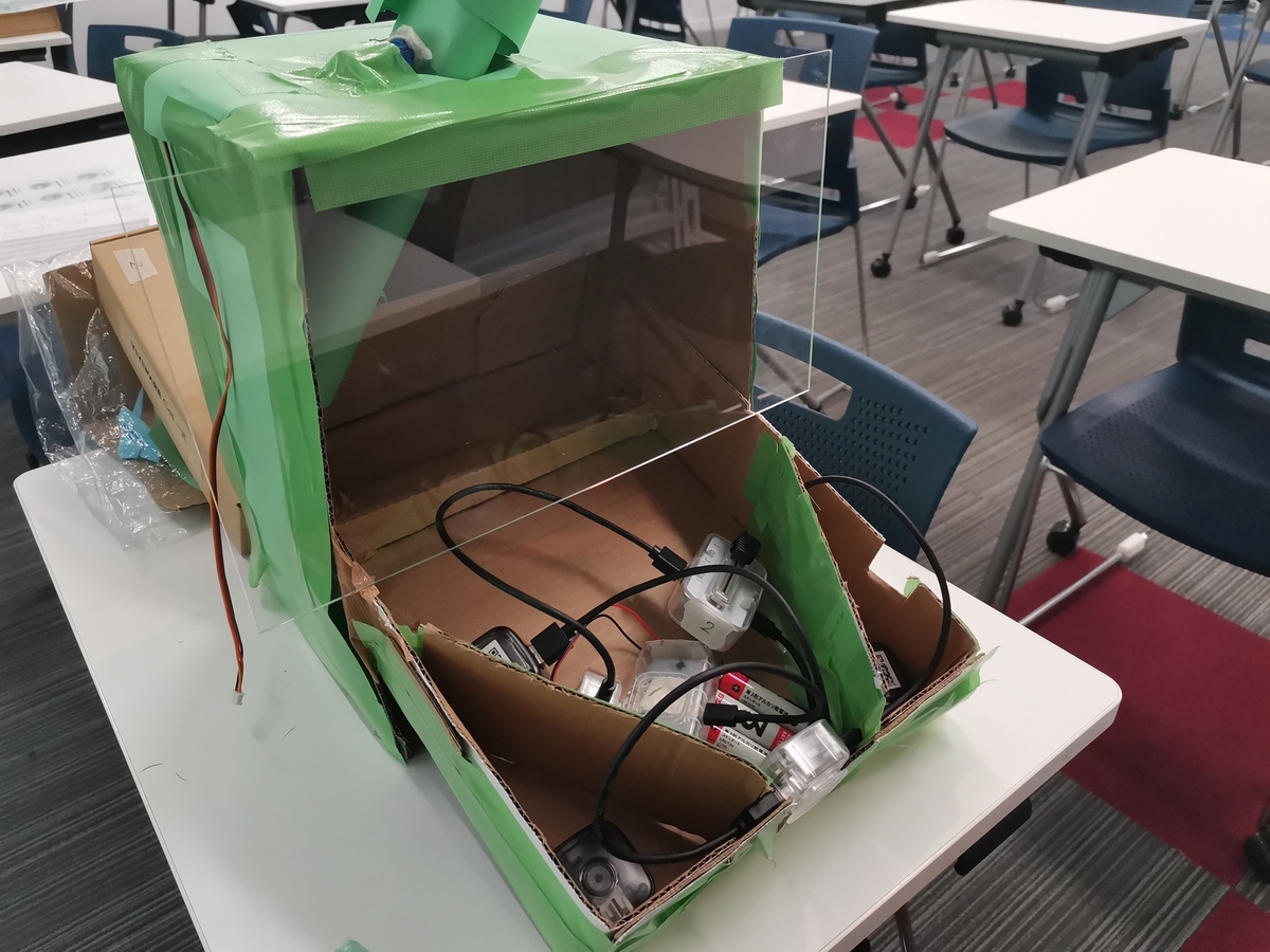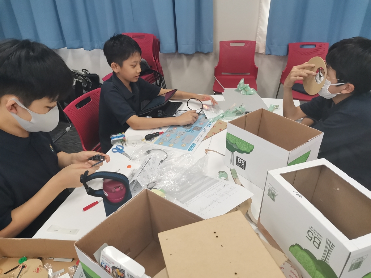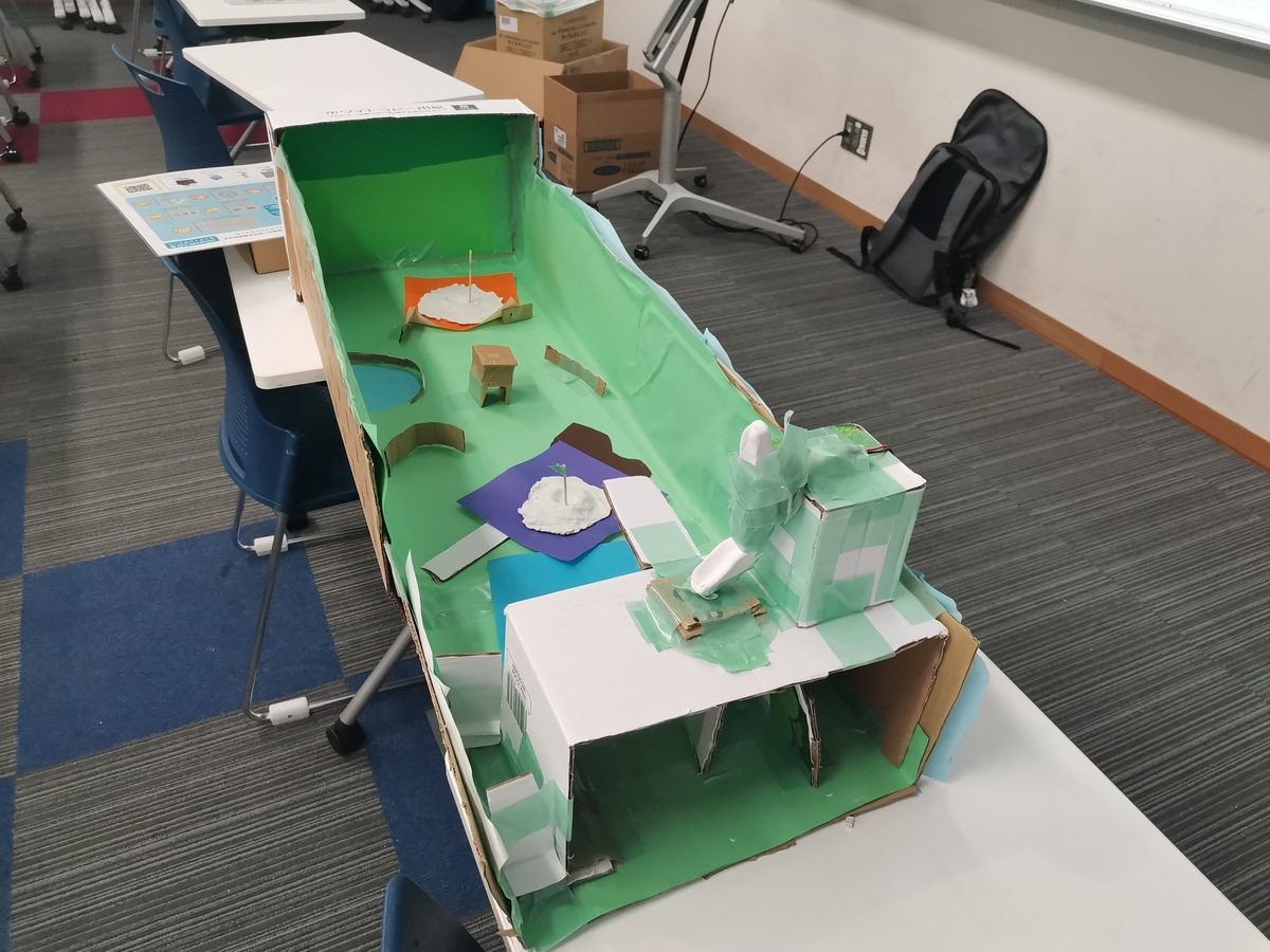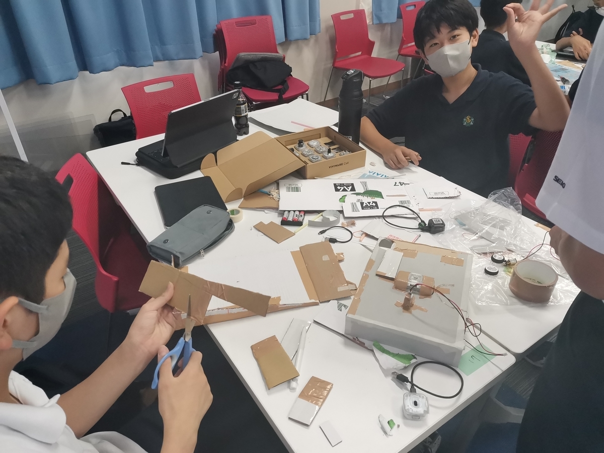 4回目、5回目は製作です。 今回の製作を見ていて一番役に立ったものは段ボールです。3回目までのアイディアで箱ものを作りたいグループが多かったのですが、そういった箱をゼロから組むと作業が大変な割に精度も出ずに不安定ということになりかねないです。 しかし、段ボールをそのまま使えば既に箱の形状をしていますので、その手間が省けます。今回は学校に印刷用紙の空き箱が大量にあるということで、それらを流用してもらいました。